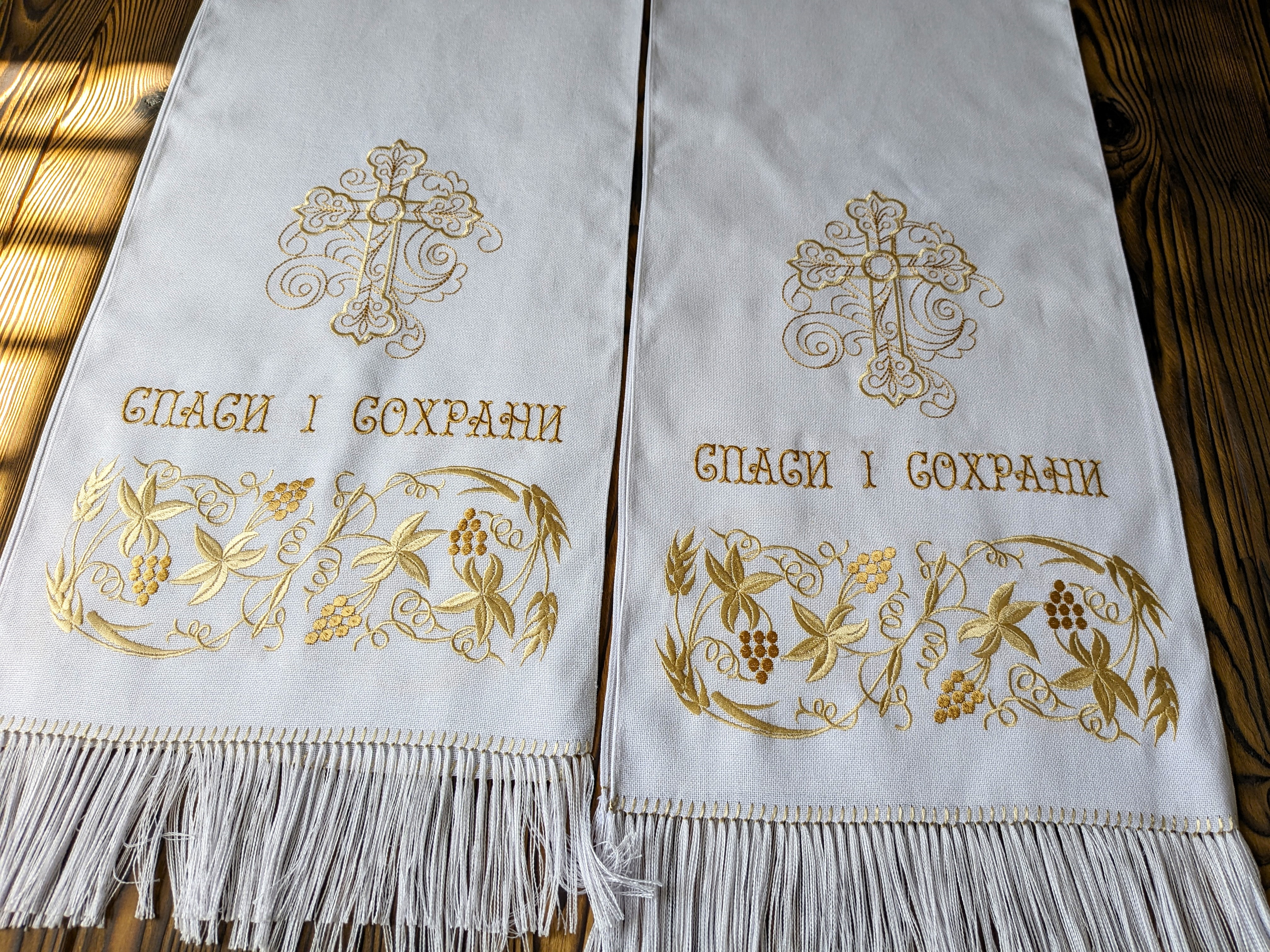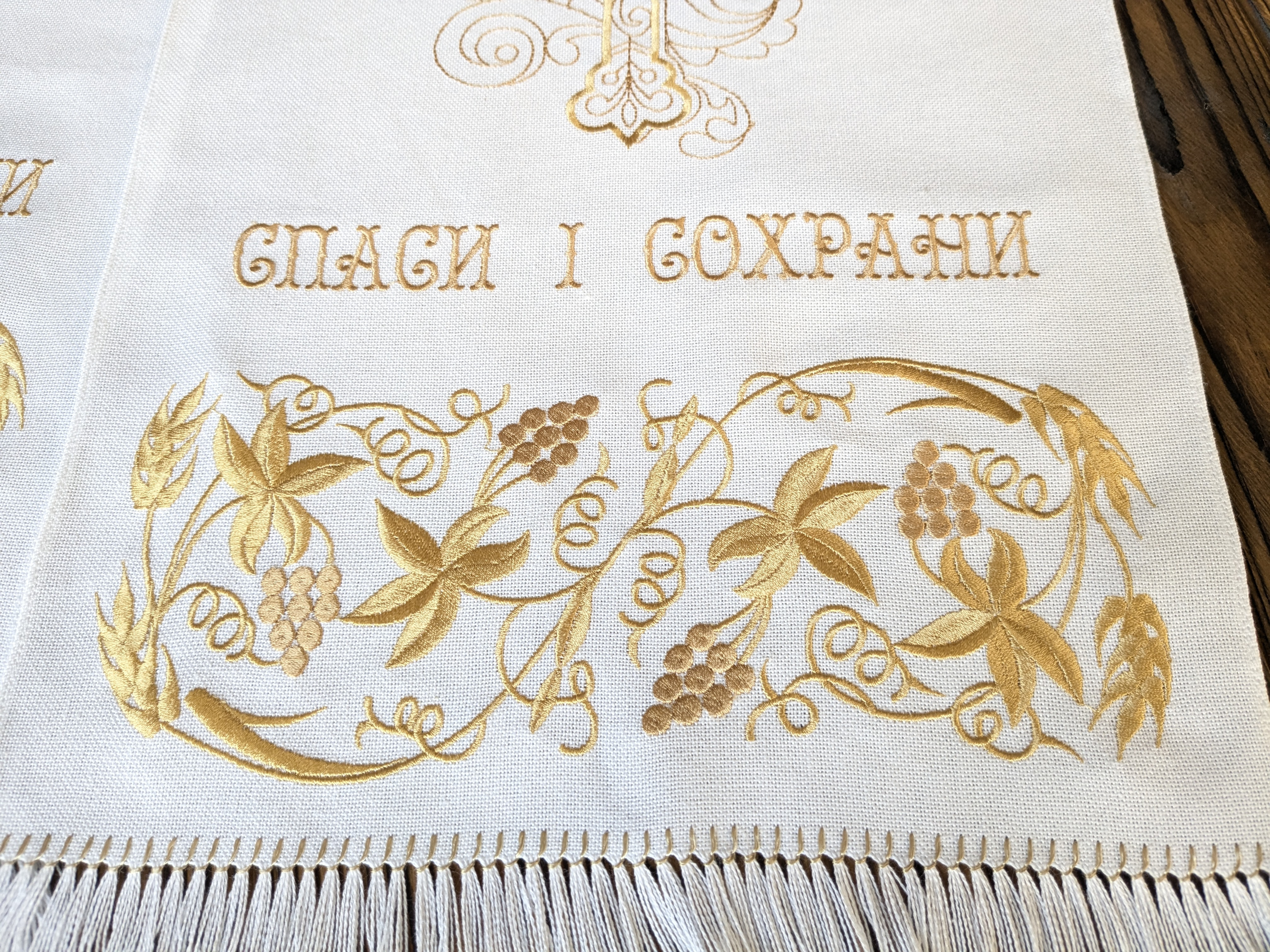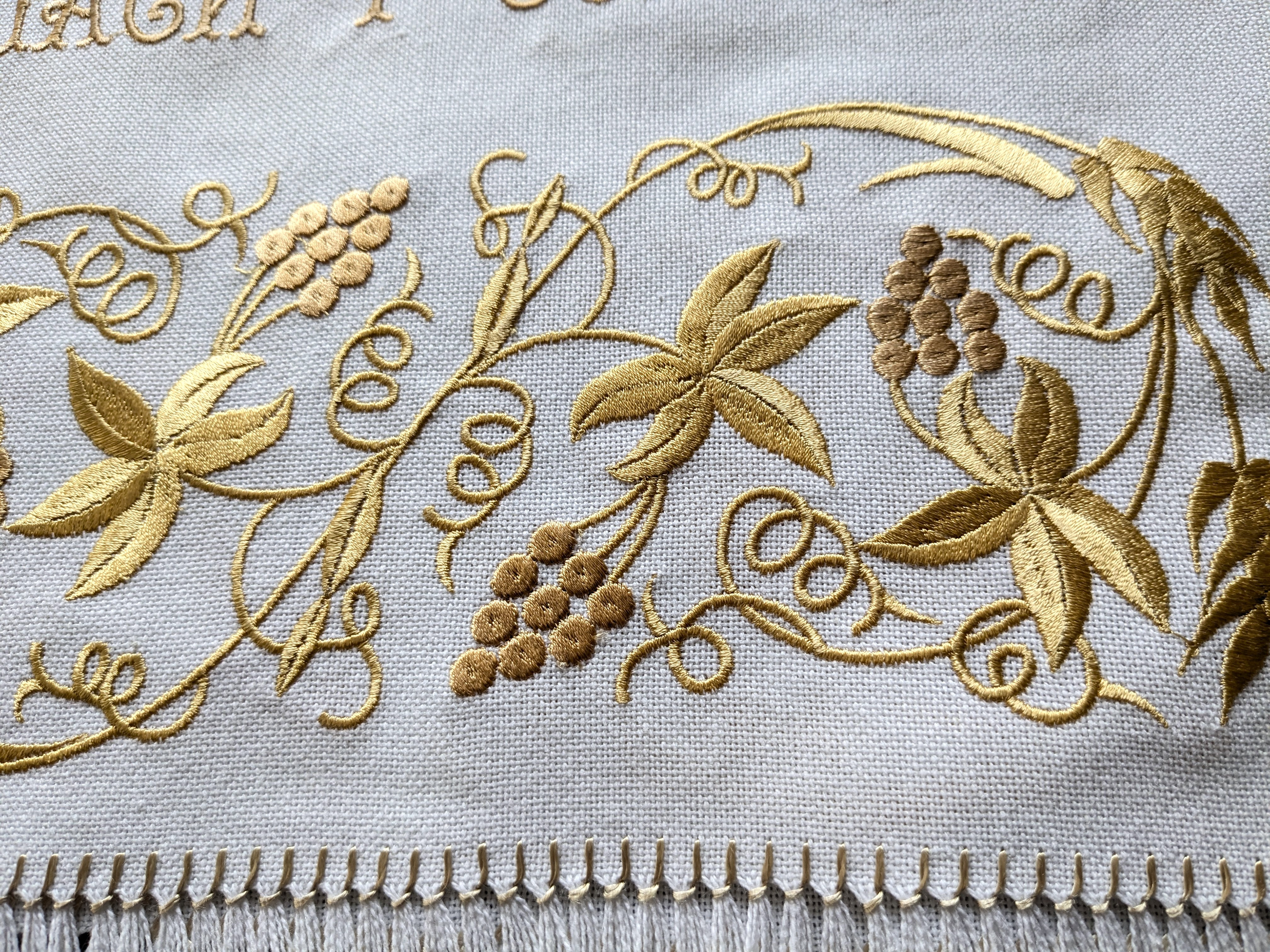 У поєднанні з машинною вишивкою рушник набуває іншого, вишуканого виміру. Машина дозволяє відтворити складні мотиви з виноградною лозою і хрестом з винятковою точністю — рівні, щільні стібки створюють контраст і блиск, шовкові нитки лягають рівномірно, відтінки темного й світлого золота грають іскрою, а малюнок залишається стійким до прання і часу, а міцність шва гарантує, що цей рушник служитиме роками, не втрачаючи свого урочистого вигляду.