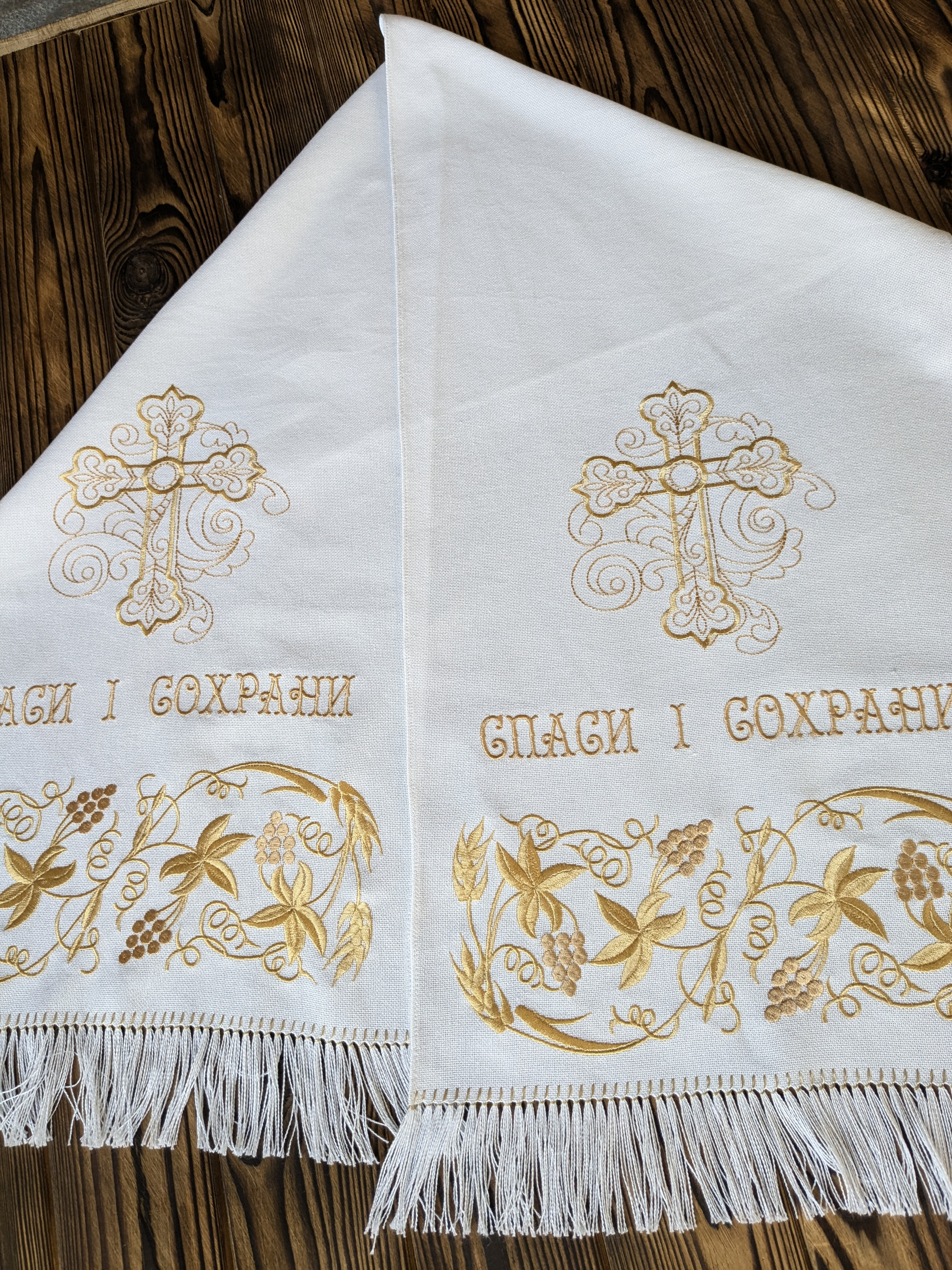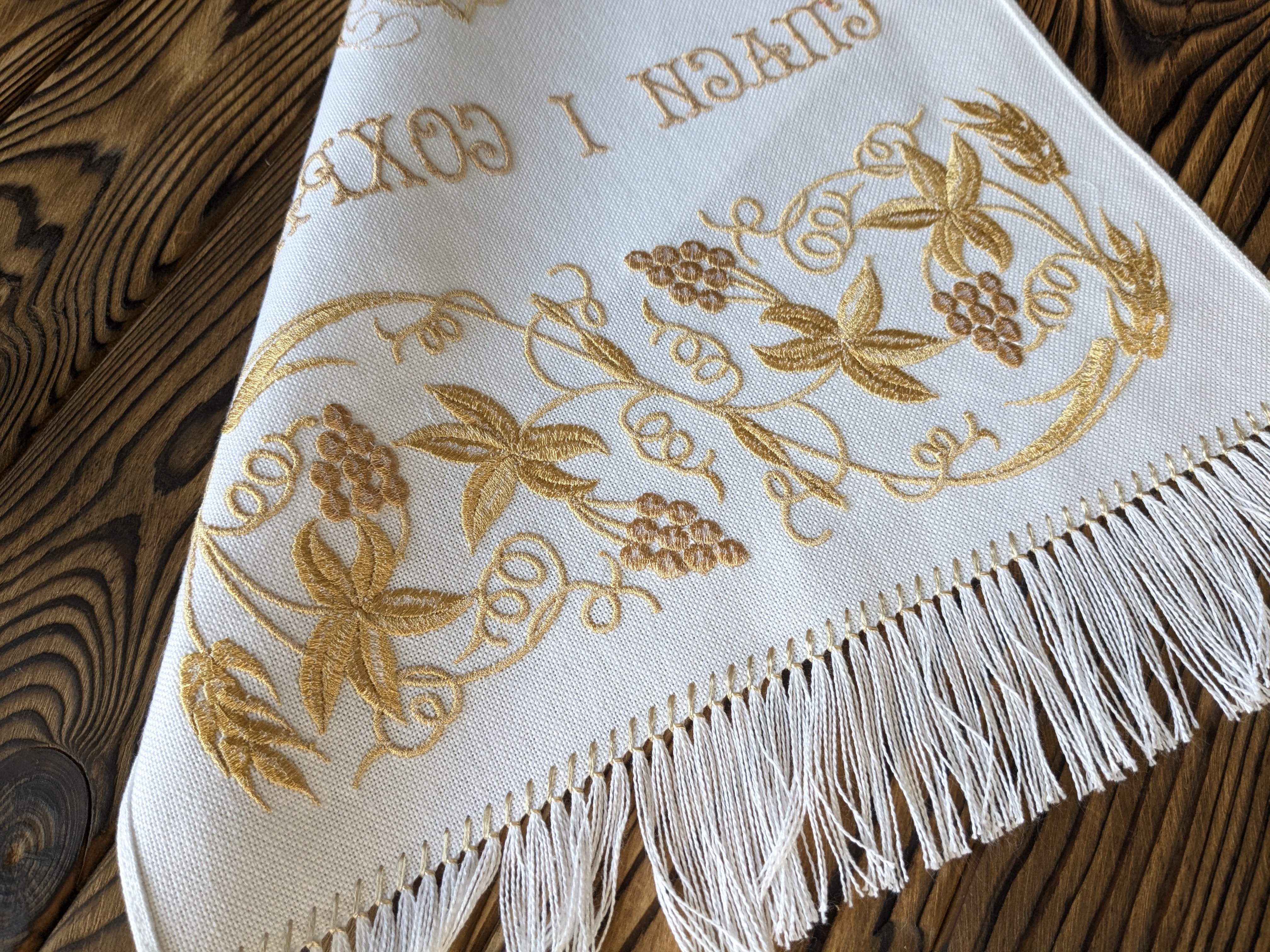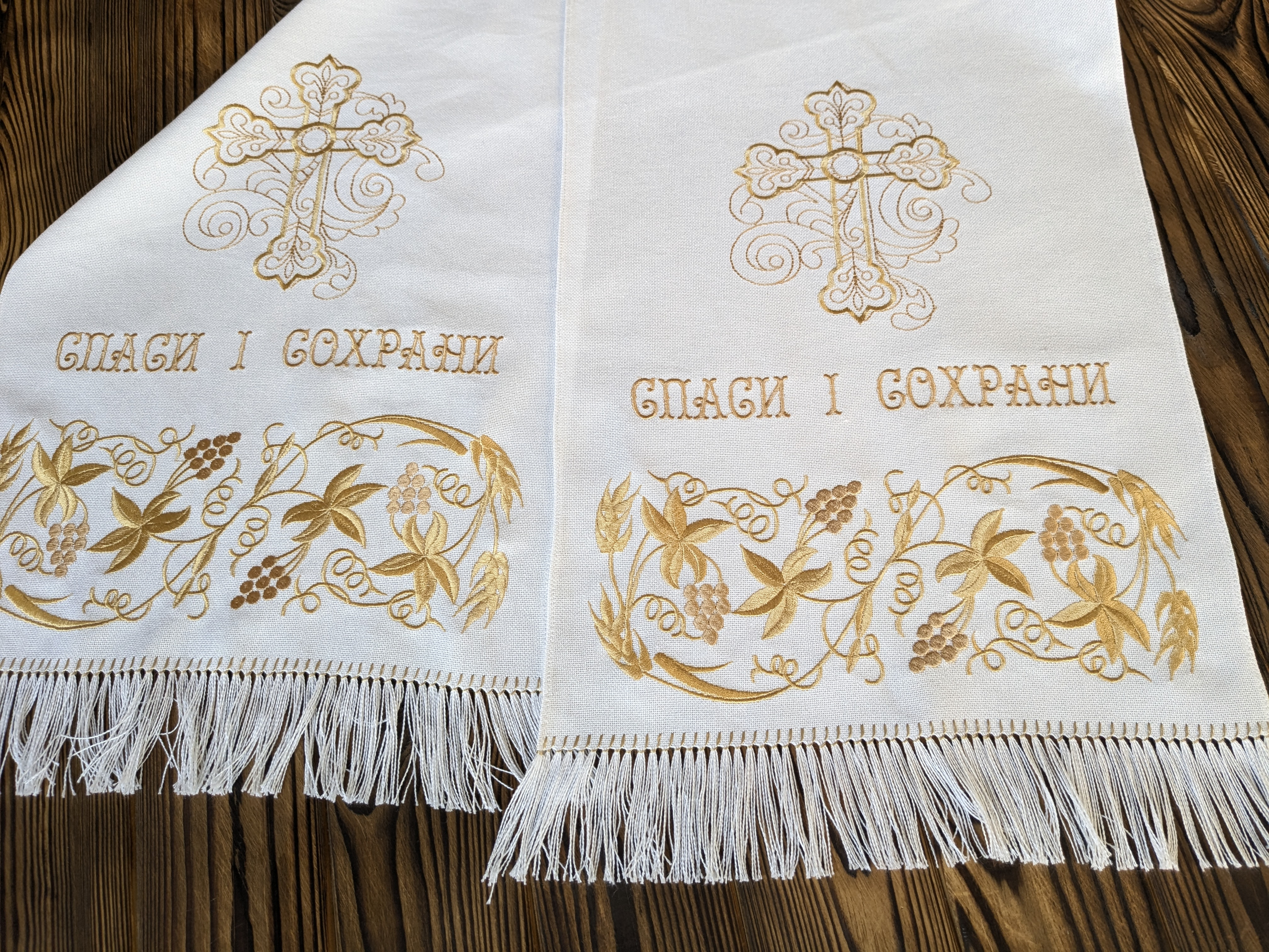 У поєднанні з машинною вишивкою рушник набуває іншого, вишуканого виміру. Машина дозволяє відтворити складні мотиви з виноградною лозою і хрестом з винятковою точністю — рівні, щільні стібки створюють контраст і блиск, шовкові нитки лягають рівномірно, відтінки темного й світлого золота грають іскрою, а малюнок залишається стійким до прання і часу, а міцність шва гарантує, що цей рушник служитиме роками, не втрачаючи свого урочистого вигляду.